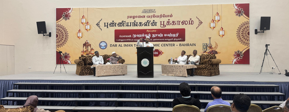 பஹ்ரைன் மண்ணில் கடந்த 25 ஆண்டுகளாகத் தமிழ் பேசும் இஸ்லாமிய மக்களின் வாழ்வியலோடும், ஆன்மீகத்தோடும் பின்னிப் பிணைந்துள்ள தாருல் ஈமான் தமிழ் இஸ்லாமிக் சென்டர், 2026-ம் ஆண்டிற்கான ரமலான் வரவேற்பு நிகழ்ச்சியை "புண்ணியங்களின் பூக்காலம்" என்ற தலைப்பில் மிகப்பிரம்மாண்டமாக நடைபெற்றது, அல்ஹம்துலில்லாஹ். அரங்கம் நிறைந்த மக்கள் கூட்டமும், இணையதளம் வாயிலாக வளைகுடா நாடுகள் மற்றும் இந்தியாவிலிருந்தும் இணைந்து இந்த நிகழ்வை சிறப்பித்தார்கள்.